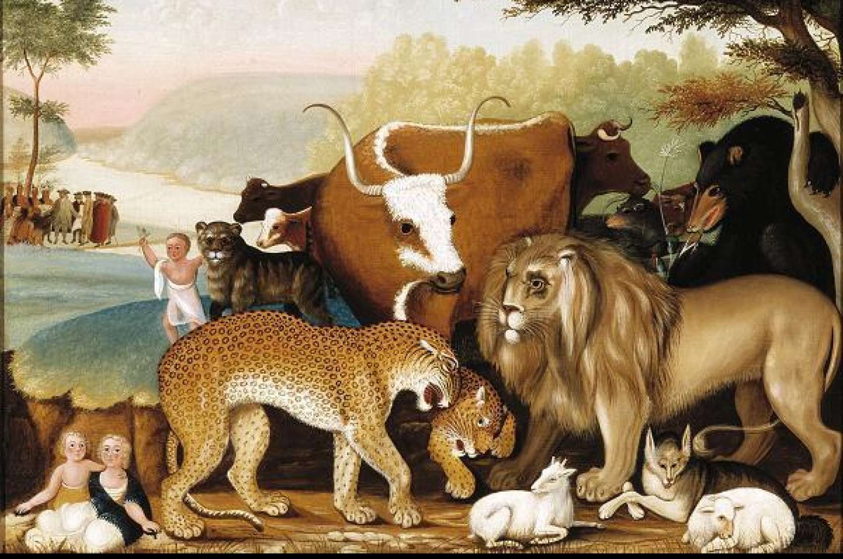 Alice Ford suggests that we should accept Hicks’ Kingdoms and the farms as a moral allegory for mankind’s nature and its capacity for order and peace. Hicks preached through his paintings about the human quest for a redeemed soul, most likely inspired by his theological beliefs, one of them being the Inner Light, a fundamental Quaker doctrine. Its founder, George Fox, explained that along with scriptural knowledge, many individuals achieve salvation by yielding one’s self-will to the divine power of Christ and the “Christ within”, or “God in everyone” a concept taken from the Bible’s Colossians 1:27. So the humans and animals in Hicks’ paintings coexist in harmony by possessing this blessing by reuniting all living beings in peace.
