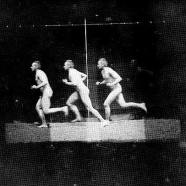 In 1884 Eakins joined Muybridge to work on his animal locomotion project. The two men outfitted a track with a series of cameras whose shutters were tripped at regular intervals as an animal or human subject walked, ran, or jumped through the space in a full period of motion. Rejecting Muybridge’s use of sequenced negatives, however, Eakins instead recorded successive exposures of motion on a single negative. In photographs such as History of a Jump (1885), he adapted Etienne-Jules Marey’s invention of a spinning slotted disk that regularly admitted light to a single point on the open lens of the camera.